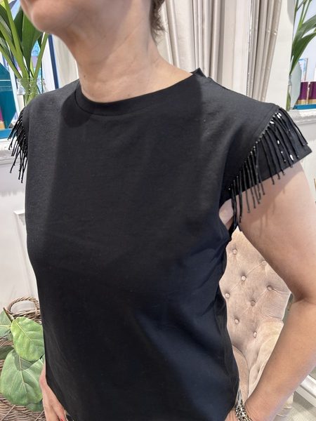 T-shirt in cotone dal design pulito, fit regolare, girocollo e manica corta ad aletta arricchita da una frangia di perline.