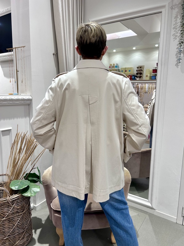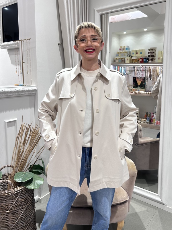 Trench corto in tessuto leggero, color avorio. Presenti tasche laterali, chiusura con bottoni.