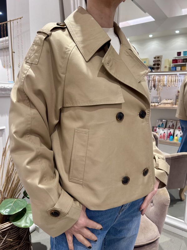 Giacca corta modello trench, color beige. Chiusura con bottoni, colletto e cinturino ai polsi.