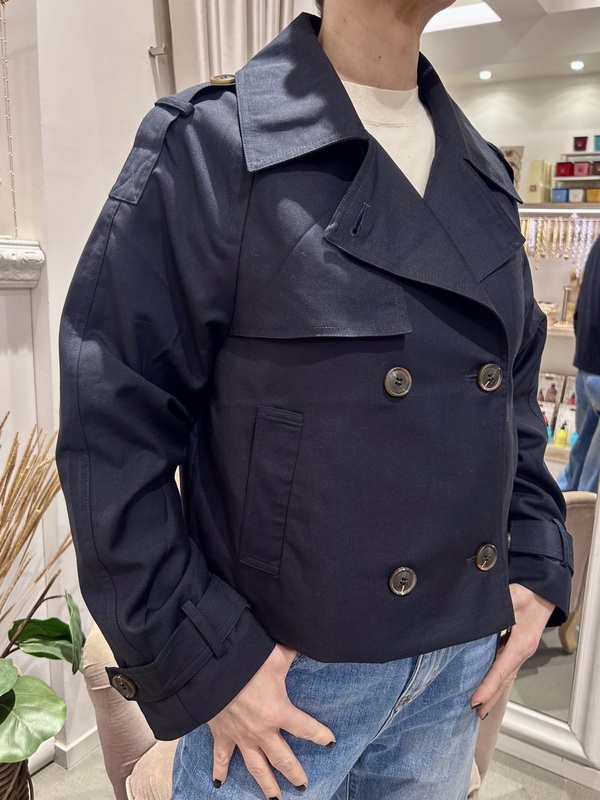 Giacca corta modello trench, color blu. Chiusura con bottoni, colletto e cinturino ai polsi.